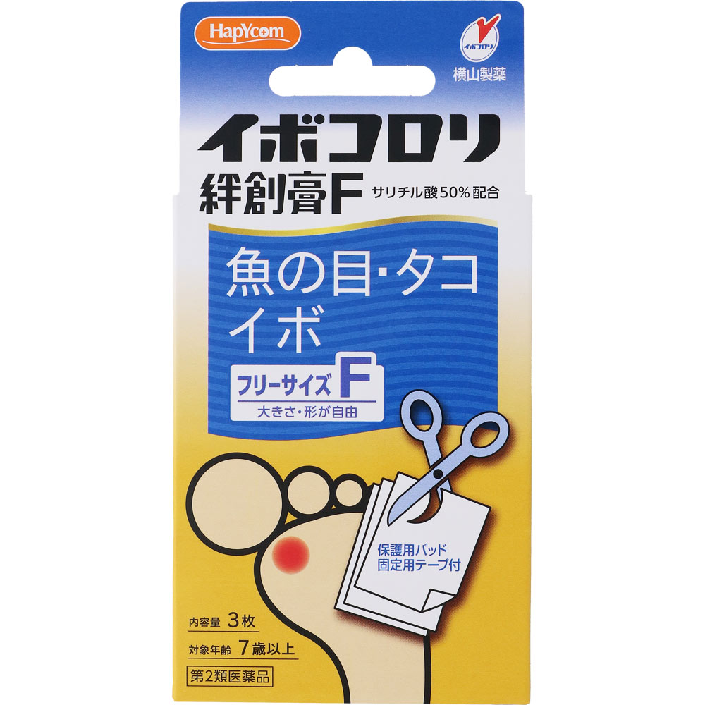 イボコロリ絆創膏・Fはサリチル酸の角質軟化溶解作用を利用した医薬品(角質剥離剤)です。厚く硬くなった皮膚をやわらかくし、魚の目・タコ・イボを取り除きます。患部の大きさに合わせて自由にカットでき、粘着性があるので、患部に密着して有効成分サリチル酸の浸透効果を高めます。又保護用パッドが外部の刺激による患部の痛みをやわらげます。