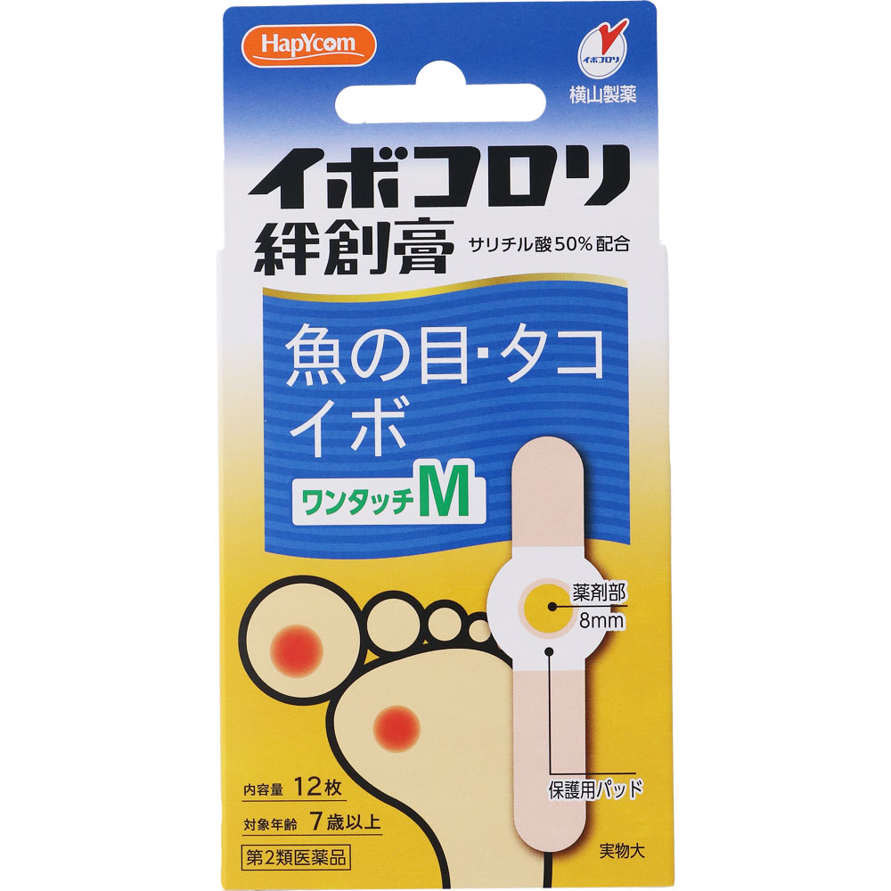イボコロリ絆創膏はサリチル酸の角質軟化溶解作用を利用した医薬品(角質剥離剤)です。厚く硬くなった皮膚をやわらかくし、魚の目・タコ・イボを取り除きます。薬剤部に粘着性があるので、患部に密着して有効成分サリチル酸の浸透効果を高めます。又保護用パッドが外部の刺激による患部の痛みをやわらげます。