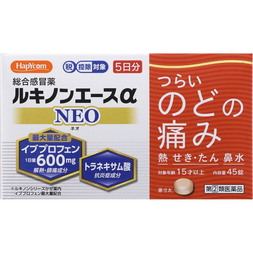 ●ルキノンエースαネオは、かぜの原因となるのど粘膜の炎症に、イブプロフェン、トラネキサム酸、カンゾウ乾燥エキスの3成分がのどの痛みやハレを抑えるほか、L-カルボシステインが絡むたんの排出を助けるなど、9種類の有効成分が優れた効果を発揮する総合感冒薬です。
