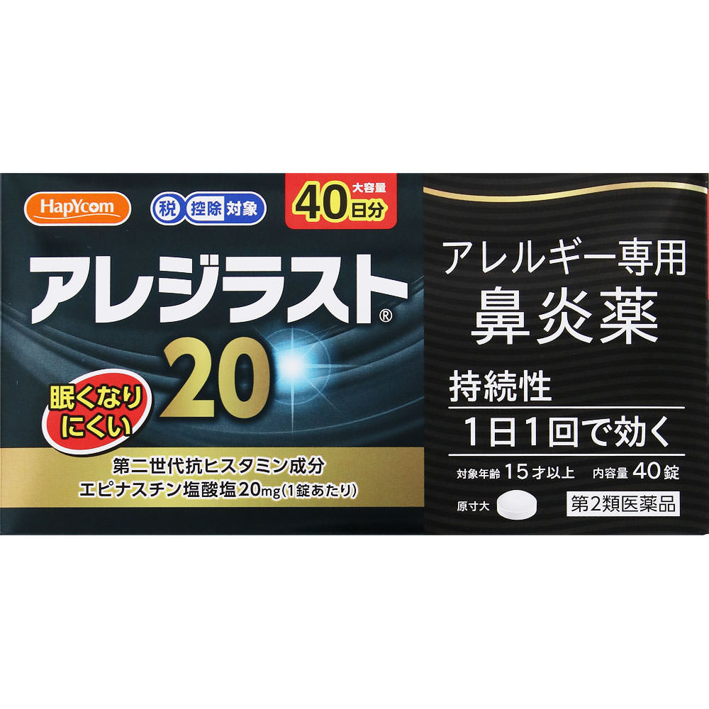 アレジラスト20は、アレルギー症状の元となる原因物質をブロックするだけでなく、原因物質の放出を抑える第2世代抗ヒスタミン剤の「エピナスチン塩酸塩」を配合したアレルギー用薬です。1日1回就寝前の服用で、花粉やハウスダストなどによる鼻のアレルギー症状にすぐれた効果を発揮します。